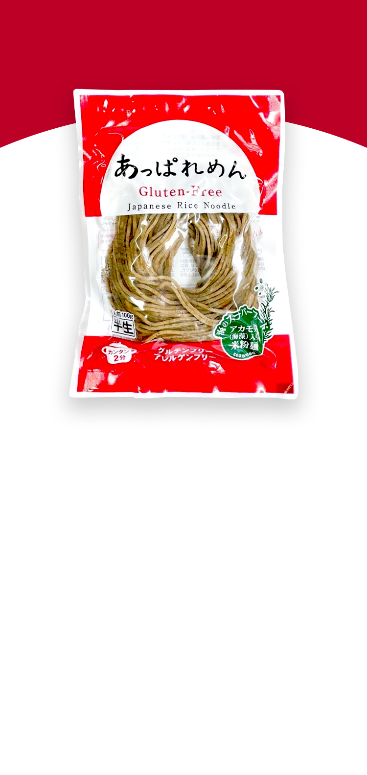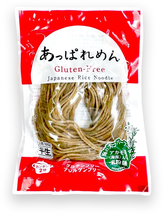 原料は、全て国産。米、アカモク、馬鈴薯澱粉のみ。生産ラインでは、小麦、蕎麦を製造していませんので混入の心配はありません。