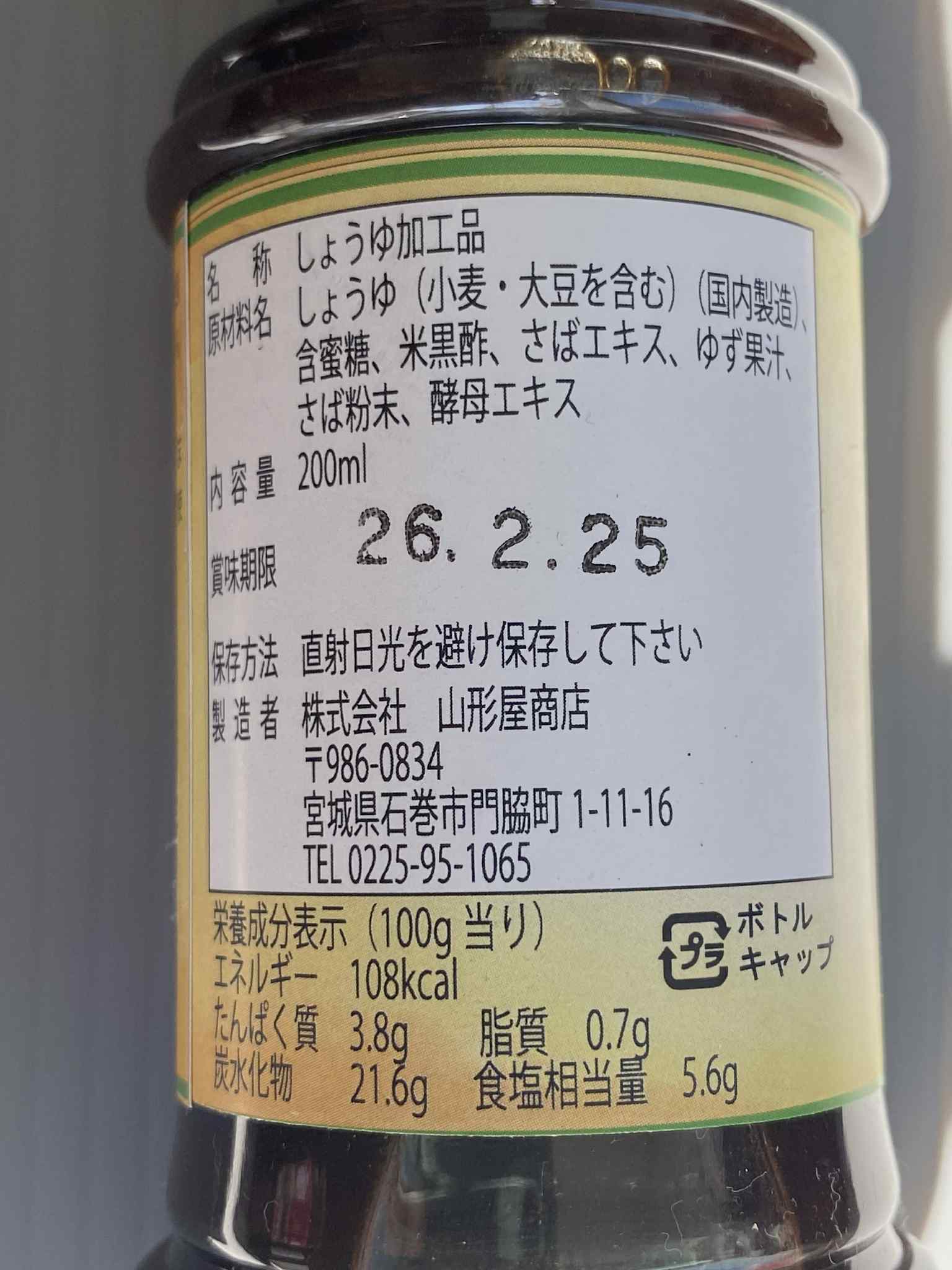 原材料:しょうゆ(小麦・大豆を含む)、含蜜糖、米黒酢、さばエキス、ゆず果汁、さば粉末、酵母エキス